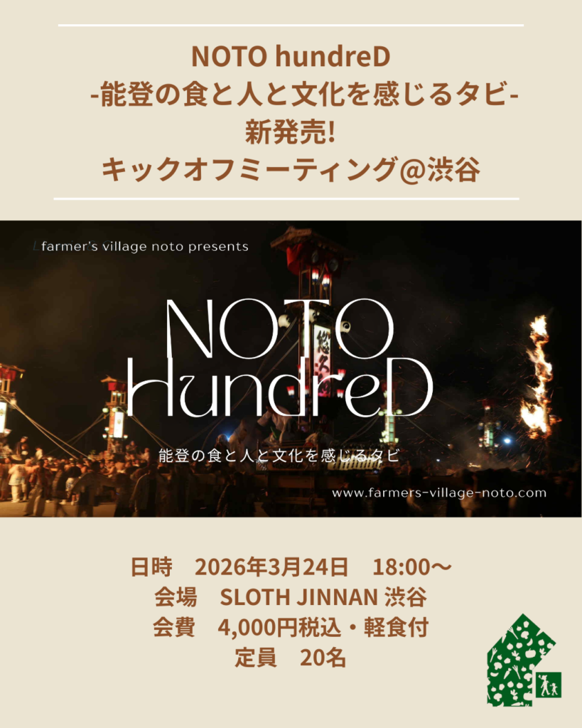 NOTO hundreD-能登の食と人と文化を感じるタビ- 新発売! 日時 2026年3月24日(火) 18:00~20:00 会場 SLOTH JINNAN 渋谷区神南1-14-7 ワイズ神南ビル2階 会費 4,000円税込・軽食付 定員 20名 主催 オーガニックベース石川 私たちFamer’s Village NOT... -